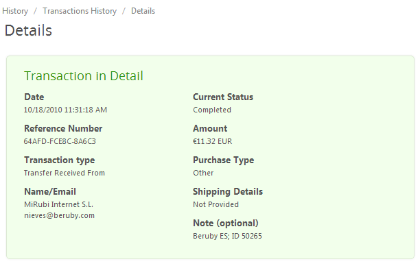 A continuación te muestro el primer pago que me hizo beruby el 18 de Octubre de 2,010 a través del procesador de pagos AlertPay (Actualmente Payza):